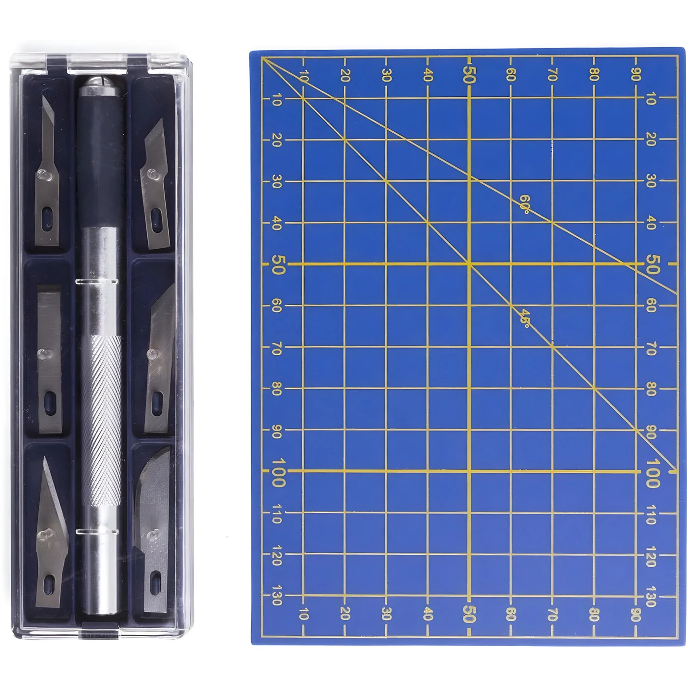 This hobby knife set is perfect for model makers and creative hobbyists. The complete set of 8 pieces comes in a handy storage box, so everything is neatly organised and immediately at hand. With this set you can perform precise and fine cutting work effortlessly. Includes a blue cutting mat for extra ease of use.