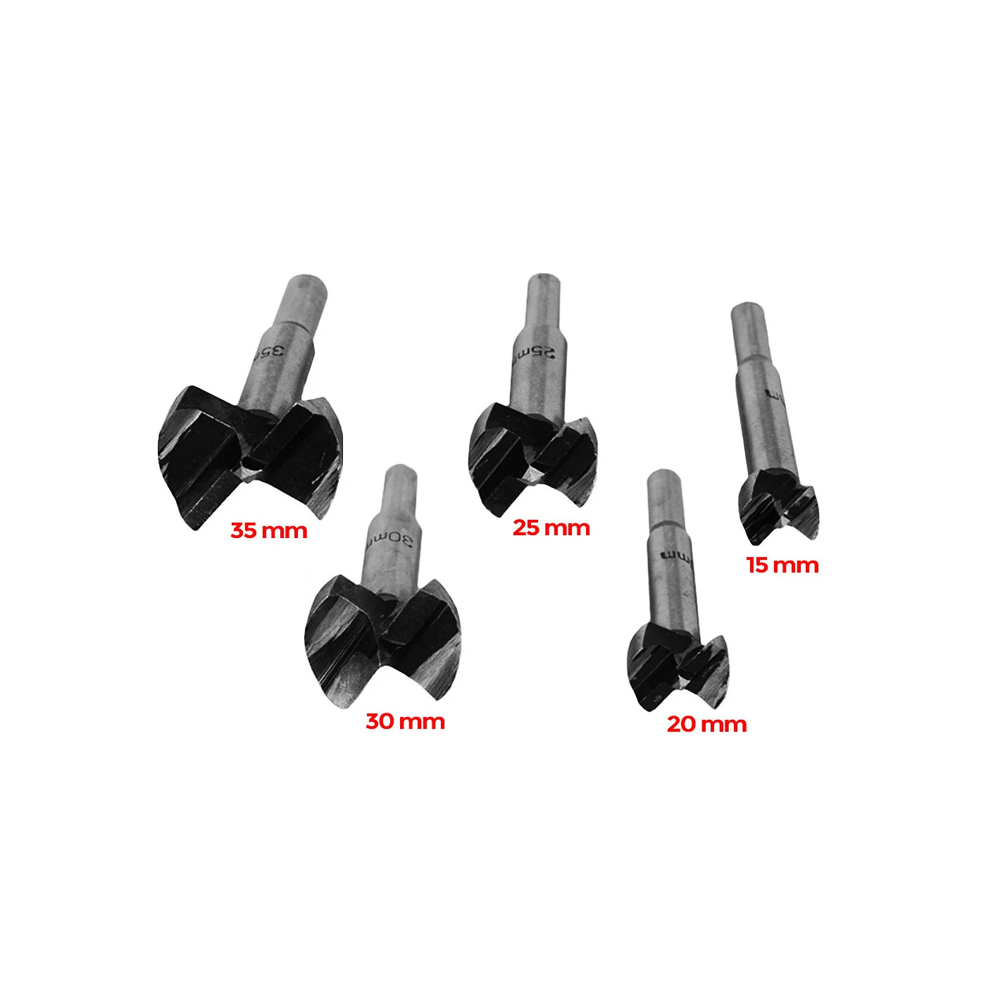 The diameters of the drills are: 15, 20, 25, 30, 35 mm.