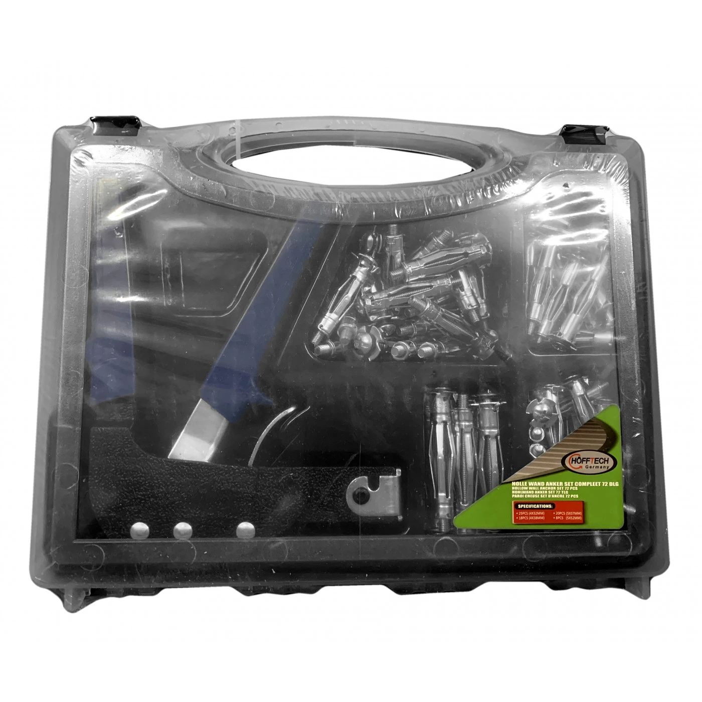 This set contains various screws and plugs to hang something on a hollow wall.