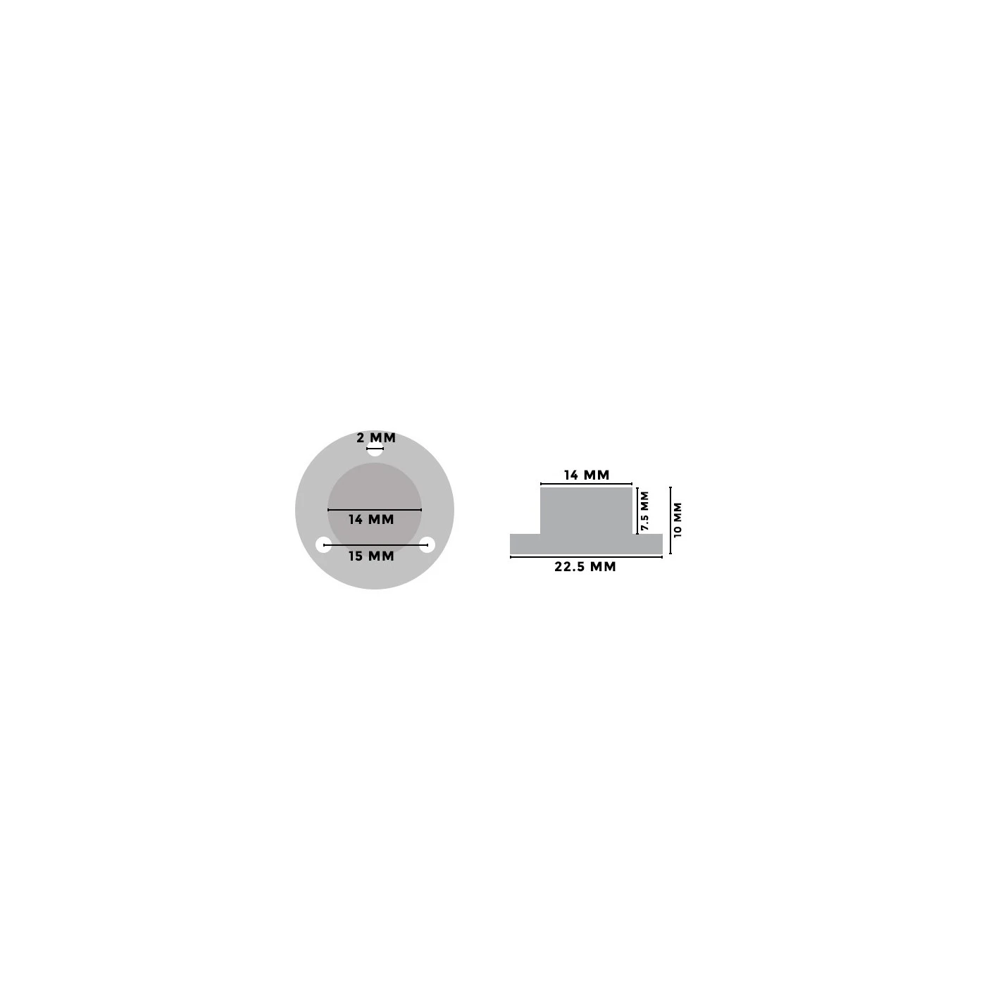 Height: 10 mm, diameter: 22 mm, diameter screw holes: 2 mm (see photo 2)