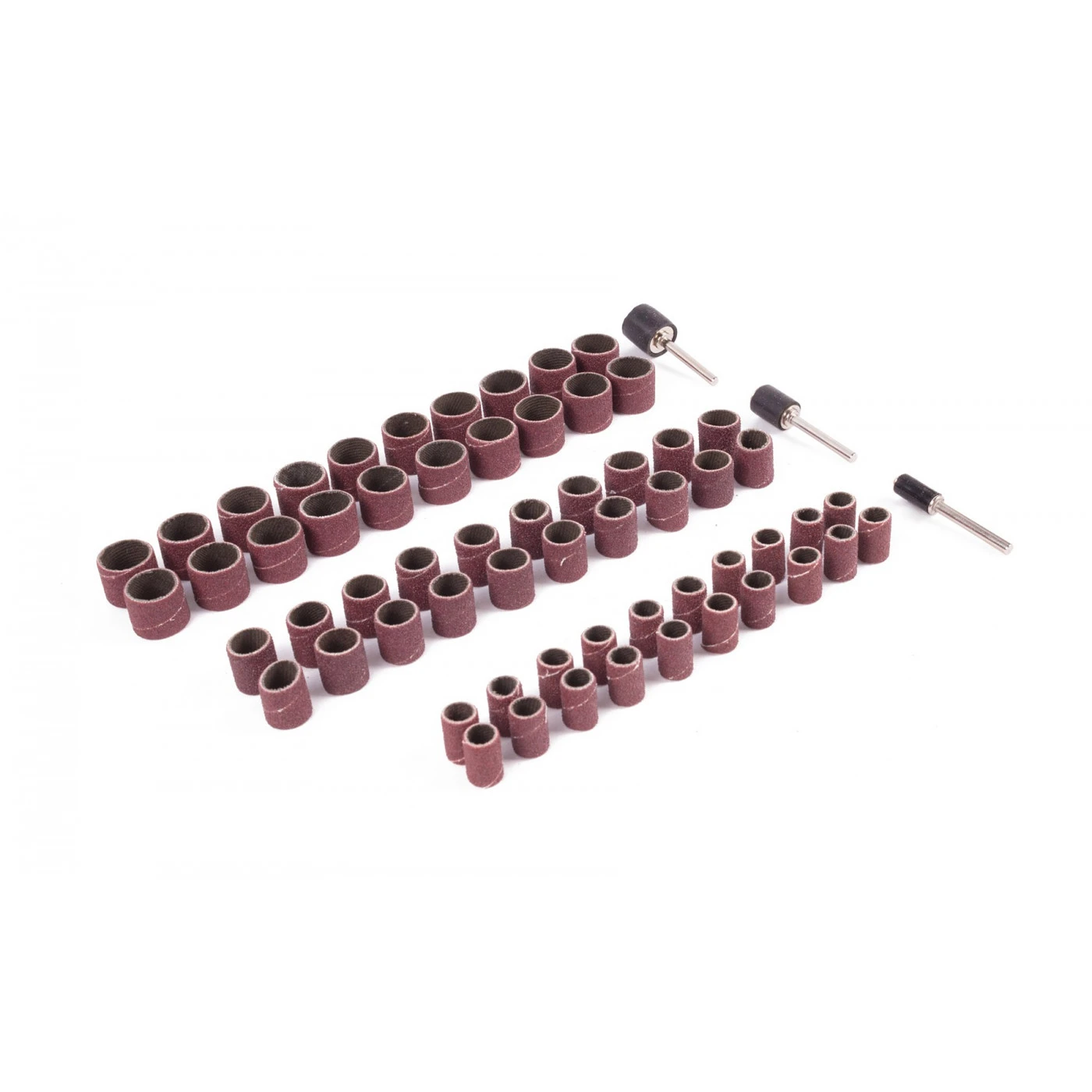 This set with 60 sanding belts can be used for sanding wood, plastic and metals. Suitable for cleaning, removing rust, grinding, dusting, deburring, polishing and stripping metal surfaces. The set comes with 2 mandrels and can be used with any drill and multitool such as those of dremel and proxxon and similar machines.